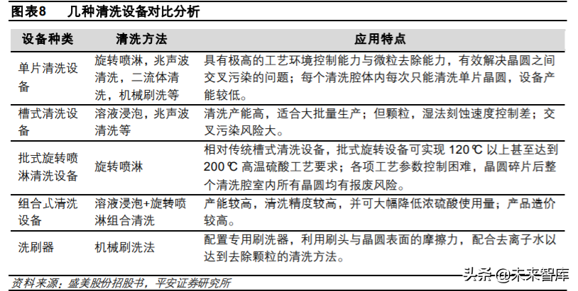 1) 不同的清洗方法往往构成不同设备厂家的核心竞争力,相关厂家通过专利对各自的技术路线进 行保护。例如对于单片清洗设备,不同厂家可以选择旋转喷淋、兆声波等不同方法进行清洗。 不同方法拥有不同的优势,这也给予了后起玩家进行差异化竞争的机会。