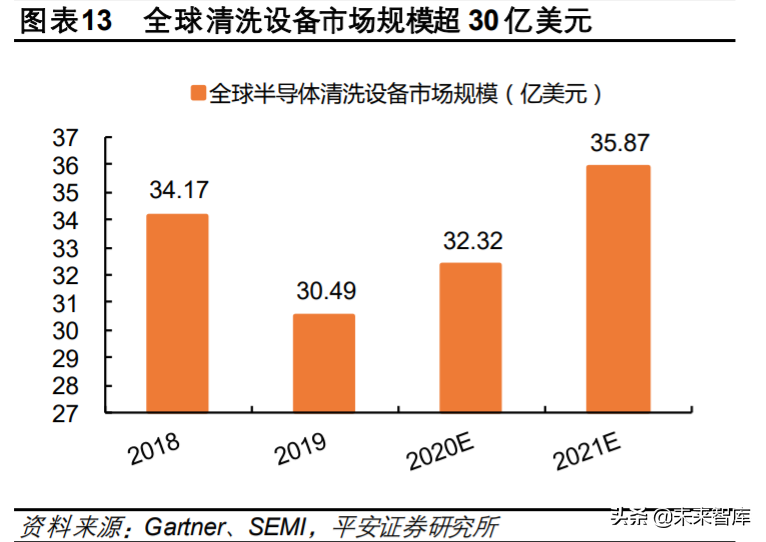 SEMI 最新预测,2020年、2021年全球半导体设备市场将分别增加 6%,11%。我们假设清洗设备 占比不变,则 2020年、2021年全球半导体清洗设备市场规模将分别达 32.32亿美元、35.87亿元。