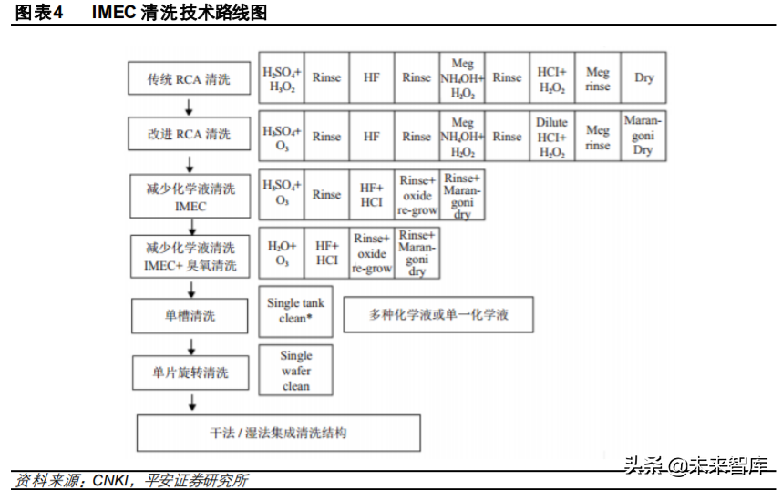 ④IMEC清洗:IMEC(Interuniversity Microelectronics Center)在清洗工艺技术中做了大量的研究 工作,其中最重要的贡献是应用了稀释的 RCA 清洗技术,并且 IMEC已经描绘出未来的清洗技术发 展方向:清洗技术是朝着减少化学液及清洗流程的方向发展。