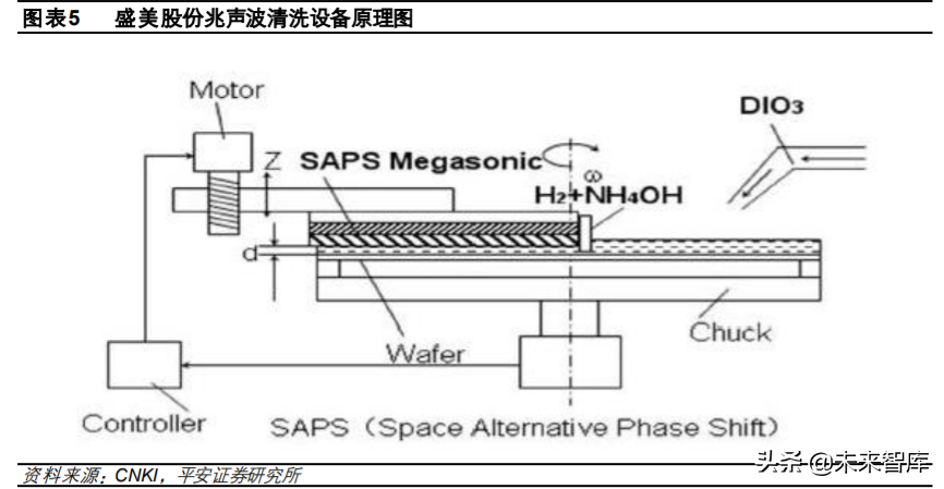 l 超声波技术的关键是如何得到均匀的能量,盛美专利技术 SAPS(Space Alternative Phase Shift, 空间交替相移技术),通过周期性变化的超声波与硅片的距离,以及间断性的开关兆声波发生器, 使得一定时间内,传递到硅片上的总能量相等。克服了超声波能量均匀性难题,在实际运用中 效果良好。