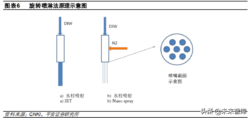 l 之后推出 Nano Spray 技术:将 N2通入去离子水中,形成水雾,以很高的速度喷到硅片表面, 成为去除颗粒的动力,以解决图形坍塌问题。这种技术中,水珠颗粒越大,冲击力越大。如何 得到小且均匀的水珠是关键技术。水珠的大小主要通过改变喷嘴孔径实现,通过调节 N2的大小 也能改变冲击力。