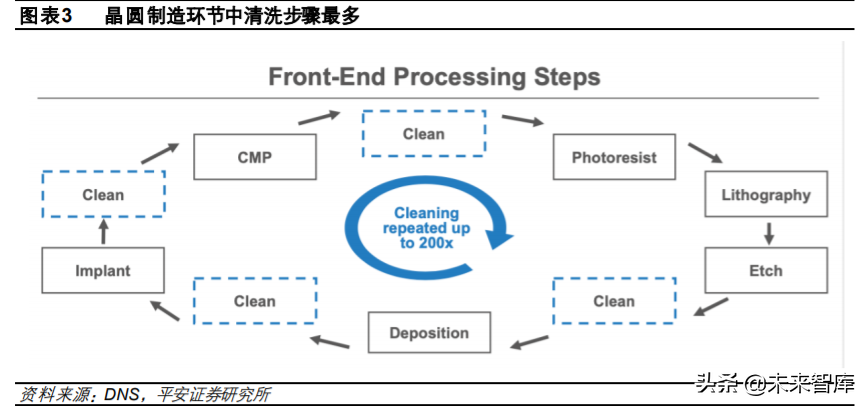 三大环节中,晶圆制造环节的清洗步骤最多,清洗设备运用也最多,几乎每一步光刻、刻蚀、沉积、 离子注入、CMP(化学机械抛光)均需要经历清洗工艺。