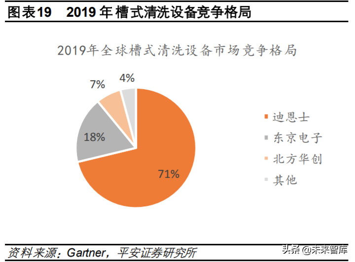 两大类核心清洗设备中:1)单片清洗设备的全球供应商分别为迪恩士、东京电子、拉姆研究、韩国 SEMES、盛美股份。2019年迪恩士、东京电子、拉姆研究份额分别为 45%、29%、16%,CR3达 到 90%。2)槽式清洗设备中,2019年迪恩士、东京电子、北方华创份额分别为 71%、18%、7%, 迪恩士一家独大。