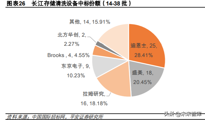 (3)在长江存储近几年的半导体清洗设备招标中,盛美股份获得 20%的清洗设备份额,北方华创 份额为 2%,均高于其全球平均水平。国产清洗设备厂有望把握国产芯片产线扩产大潮,提高市占率。