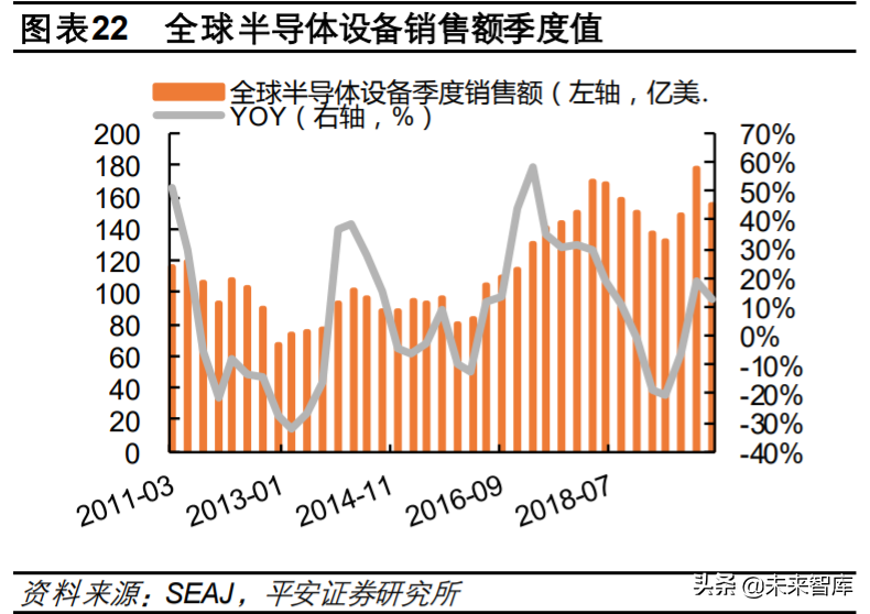 全球半导体设备市场空间庞大。根据日本半导体制造装置协会(SEAJ)统计,2016-2018年,全球 半导体设备销售额分别为 412.4亿美元、566.2亿美元、645.3亿美元,同比增长 13%、37%、14%, 呈现三年景气向上周期。2019 年受贸易战等多方面因素影响,全球半导体设备销售额下滑 7%至 597.5 亿美元。2020 年一季度,全球半导体设备销售额达 155.70亿美元,同比增长13%。
