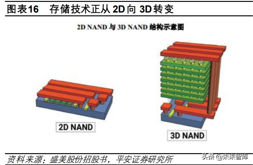 2) 当工艺尺寸达到 14nm 之后,存储技术将会达到尺寸缩小的极限,存储芯片逐步从二维(2D) 结构向三维(3D)结构推进。例如在 3D NAND(计算机闪存设备)制造工艺中,需将原来 2D NAND 中二维平面横向排列的串联存储单元改为垂直排列,通过增加立体层数,解决平面上难 以微缩的工艺问题,堆叠层数也从 32 层、64 层向 128 层发展。存储技术从 2D 向 3D 转变, 清洗晶圆表面的基础上,还需在无损情况下清洗内部污染物,对清洗设备提出了更高的技术要 求,清洗设备单台价值量不断提升。